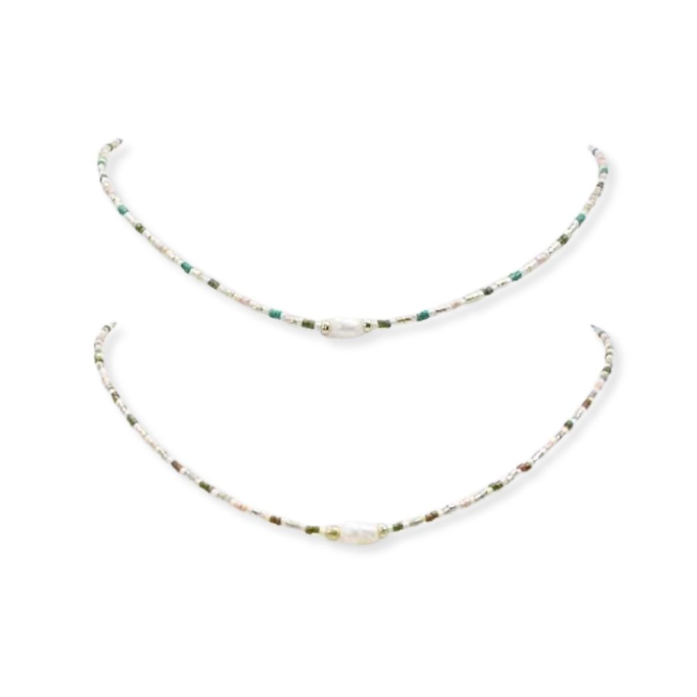BEADED NECKLACE WITH CENTER FRESHWATER PEARL. NATURAL/MIX, GREEN/MIX. SOLD IN SETS OF 2 ONLY