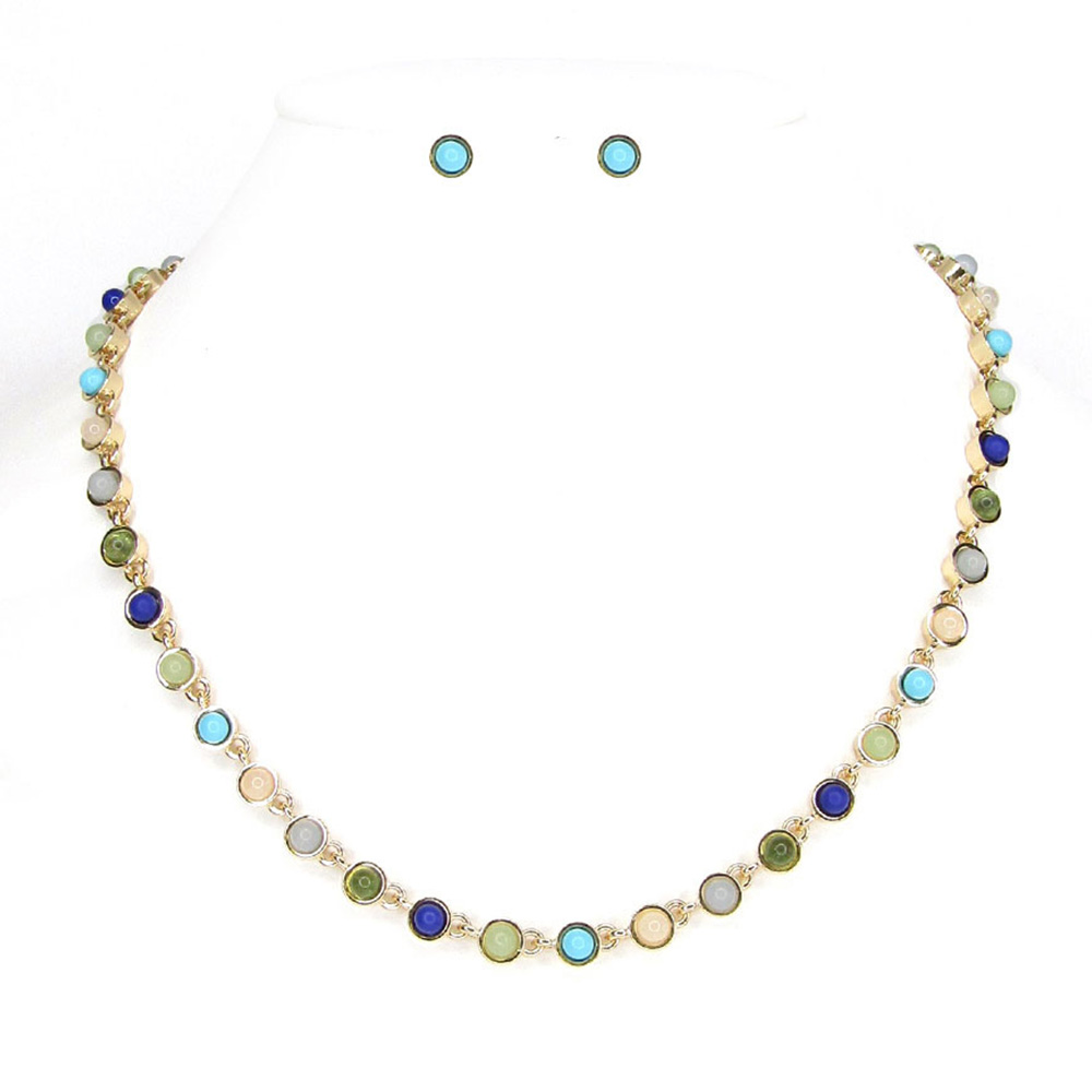 BLUE & GREEN BEZEL SET ROUND STONE NECKLACE. SEE 44225 FOR MATCHING BRACELET