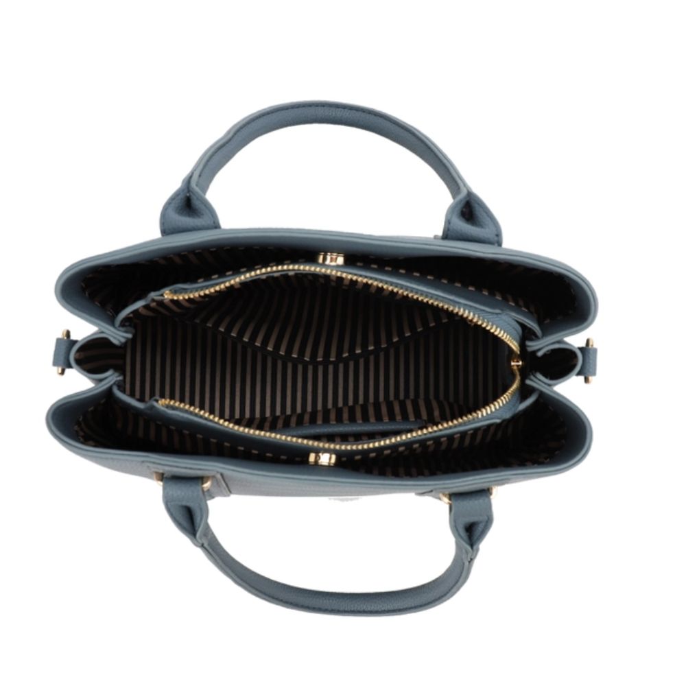 BLUE/GREY SATCHEL BAG WITH WHIPSTITCH DETAIL. 12X9X5.9