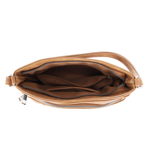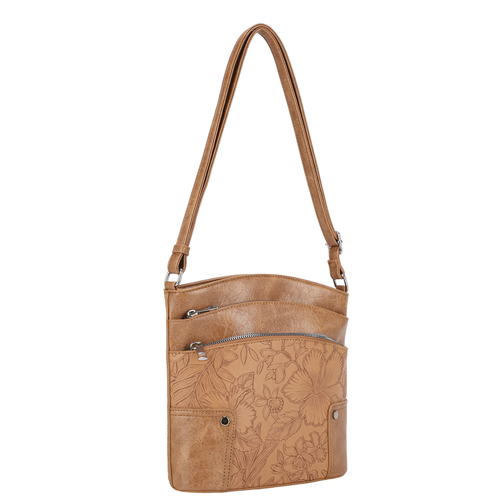 CAMEL FLORAL TOOLED MULTI ZIP CROSSBODY. 9.4X9.75X3.13