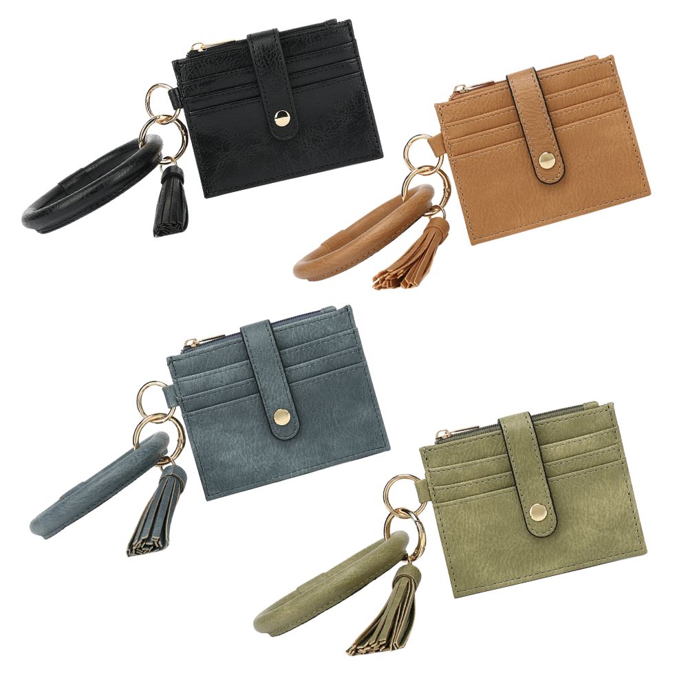 Compact and practical, this vegan leather wallet features a ring/bangle attachment, top zipper closure, three card slots, an exterior ID window, and gold-tone hardware for everyday style.
