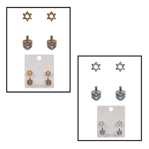 HANUKKAH THEME CRYSTAL DREIDEL & STAR OF DAVID 2 PAIR EARRINGS. SILVER, GOLD. SOLD IN SETS OF 2 ONLY