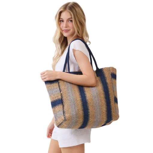 • Spacious striped tote with a roomy interior for everyday use, travel, or shopping. Comfortable shoulder handles make it easy to carry essentials, clothing, or accessories, perfect for boutiques and resort collections.