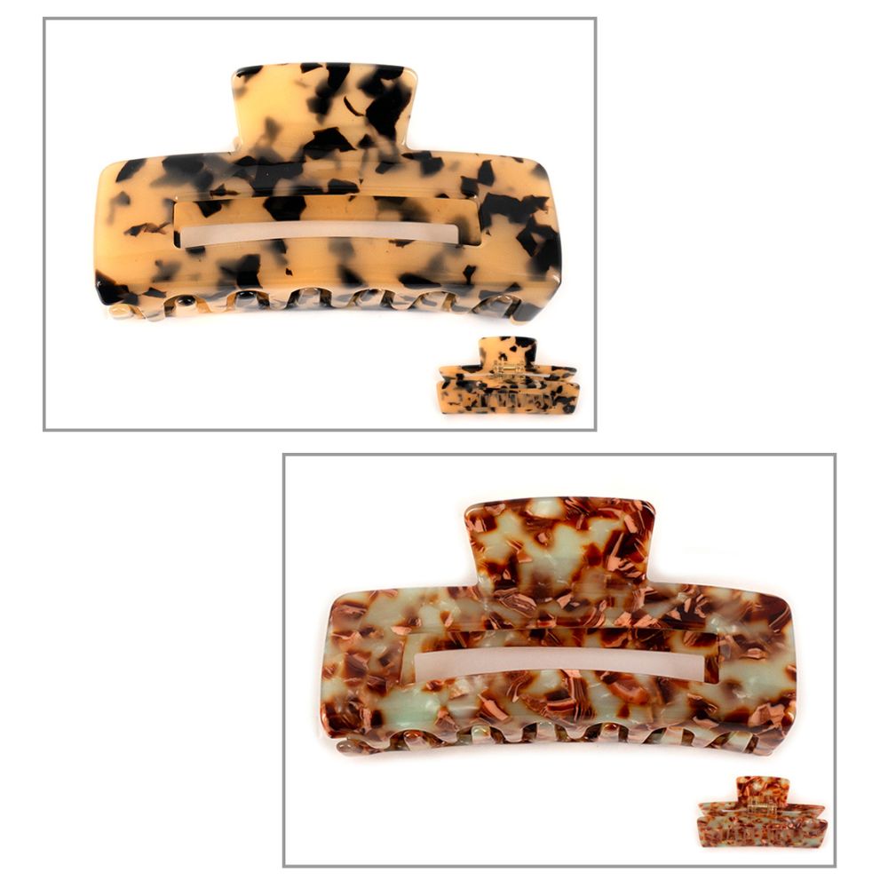 Large Rectangle Claw Clip made from durable acetate, available in two tortoise shades. Holds thick hair securely. Measures about 4″ x 1.75″