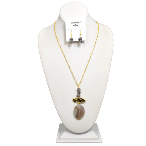 LONG GOLD & GREY STONE PENDANT NECKLACE SET