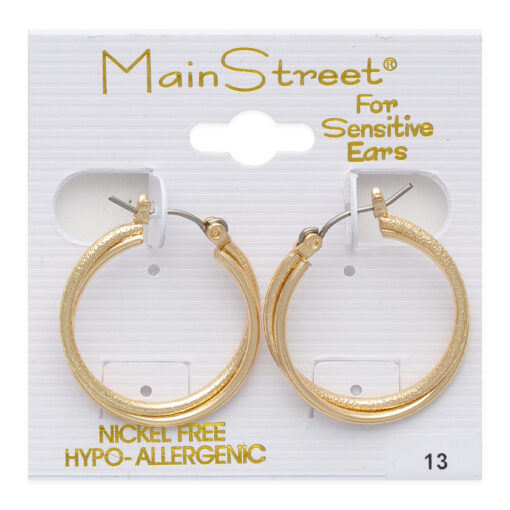 Introducing the Mainstreet #13 hoop earrings, an embodiment of classic allure with a modern twist. These stunning pieces are meticulously crafted for those who seek fashion without compromise. The textured golden finish offers a radiant glow that complements any complexion, while the secure latch-back closures assure a comfortable fit throughout the day. Designed specifically for sensitive ears, these nickel-free and hypoallergenic treasures are not only a mark of elegance but also a testament to mindful craftsmanship. Perfect for both daywear and evening ensembles, these hoops promise to become a cherished addition to your jewelry collection. Whether paired with a crisp blazer for a business meeting or a flowing maxi dress for a sunset soiree, the Mainstreet #13 earrings are sure to catch the light and draw admiring glances.