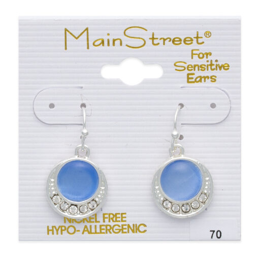 Introducing the Mainstreet #70 earrings — a testament to timeless grace and an essential addition to any jewelry collection. These charming drop earrings present a captivating sky blue centerpiece encircled by a halo of shimmering crystals that catch the light at every turn. Crafted for those with sensitive ears, the hypoallergenic properties ensure comfortable all-day wear without compromising style.