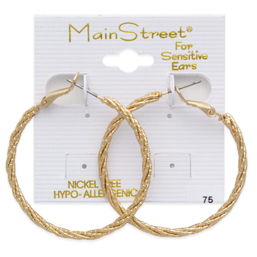 Introducing the Mainstreet #75 hoop earrings – an embodiment of timeless elegance and modern charm. Designed with the assurance of nickel-free and hypoallergenic craftsmanship, these exquisite accessories are ideal for those with sensitive ears, offering a comfortable wear day into night. Each hoop presents a mesmerizing twist of golden brilliance, catching the light to gracefully illuminate your features with every turn of the head.