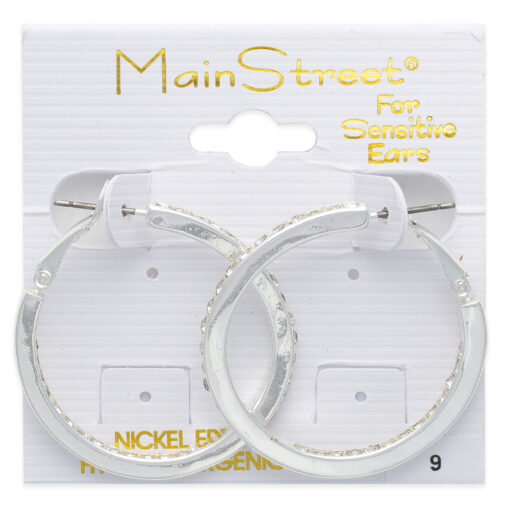 Infuse your ensemble with a spark of charm with the Mainstreet #9 hoop earrings. Meticulously crafted for sensitive ears, these radiant accessories boast a hypo-allergenic design, ensuring a comfortable wearing experience free from the worry of irritation. The classic hoop silhouette is reimagined with a sweep of embedded crystals that dance enchantingly along the curvature, catching the light with every movement. Perfect for adding a hint of sparkle to your day-to-day attire or for complementing an evening look, these versatile earrings promise to become a cherished staple in your jewelry collection.