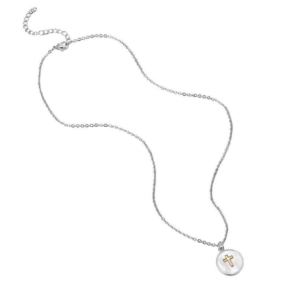 SILVER MOTHER-OF-PEARL DISC NECKLACE WITH CROSS DETAIL