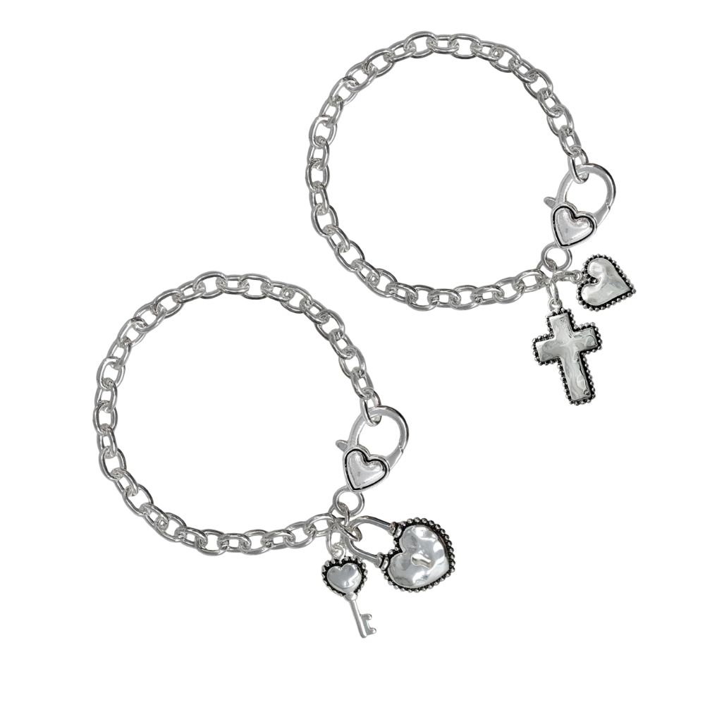 SILVER TAILORED CHARM BRACELET. HEART/KEY, CROSS/HEART. SOLD IN SETS OF 2 ONLY