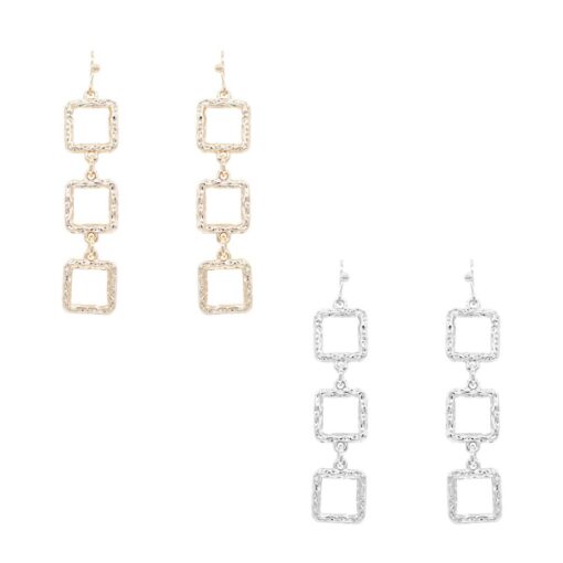 TEXTURED TRIPLE SQUARE DROP PIERCED EARRINGS. GOLD, SILVER. SOLD IN SETS OF 2 ONLY